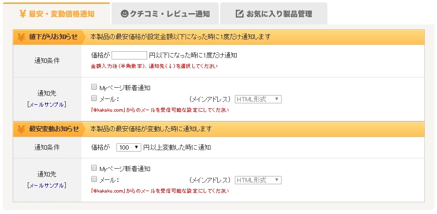 価格.comのIDを作成し、興味がある商品について「お気に入り登録」をします。するとマイページに移動しますので「¥最安・変動価格通知」のタブから「最安変動お知らせ」か「値下がりお知らせ」にチェックを入れて設定をします。