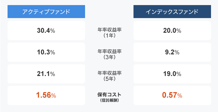 直近1年ではアクティブファンドの値上がり率がインデックスファンドを10ポイント上回ったほか、過去3年、過去5年のいずれも、アクティブファンドの運用成績がインデックスファンドを上回りました。確かにアクティブファンドの保有コスト(信託報酬)は高いですが、それを上回る運用成果を出している、運用が上手なファンドマネージャーが運用しているアクティブファンドも数多く存在するのです。