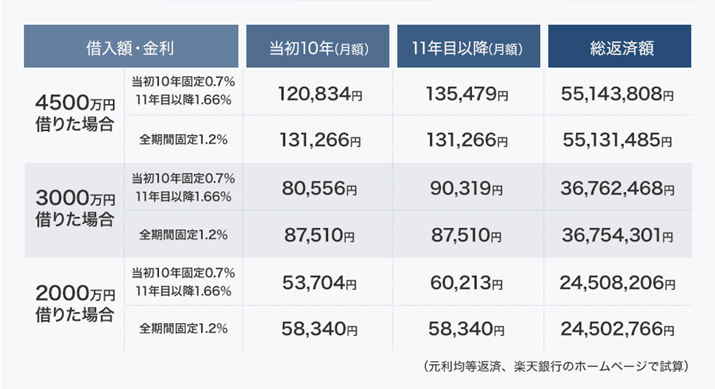 おおまかに計算すると、住宅ローンを35年借りる場合、当初10年固定0.7%で借りた住宅ローン金利が固定期間の終了後に1.66%になれば、下の表のように1.2%で35年間の全期間固定で借りる場合と返済総額がほぼ同額となります。1.66%よりも金利が高くなれば、全期間1.2%固定で借りるよりも、返済負担は重くなります。