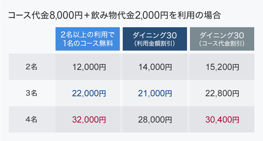 さて、グルメ特典を利用するときのポイントがいくつかあります。1つは利用人数によって割引率が変わってしまうこと。2名で1名無料サービスは2名で利用すると会計金額の50%オフと同じになりますが、4名では実質25%割引になり、割引率が低下します。飲み物代が含まれていないことにも注意が必要です。コース料理の代金が高い場合は、そのあたりも考慮して選びましょう。