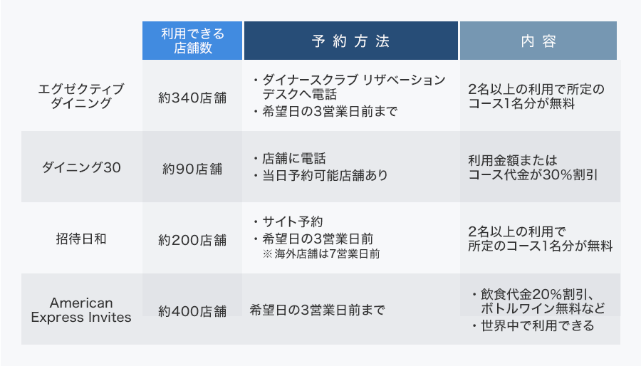 人気のグルメ特典「エグゼクティブ ダイニング」では、日本料理、フレンチ、イタリアンの有名店を中心に、2名以上で所定のコースを予約すると1名分が無料になります。一部、6名以上の利用で2名分が無料になるグループ特別プランもあります。希望日の3営業日前までに「ダイナースクラブ リザベーションデスク」に電話して予約します。