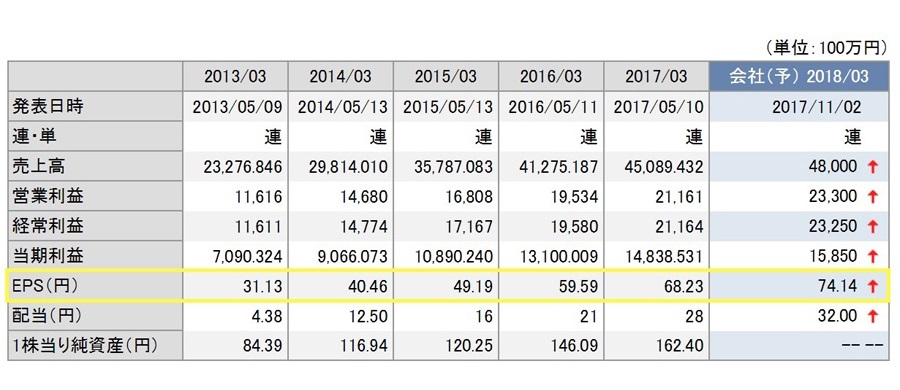 カカクコムの1株あたり純利益(EPS)の推移。カブドットコム証券より引用
