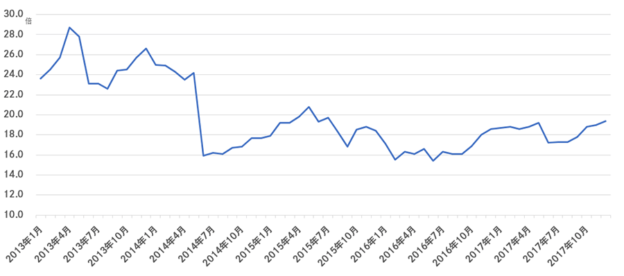 東証1部全体のPERの推移(月末値)。日本取引所グループ公表資料より作成