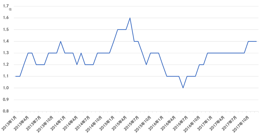 東証1部全体のPBRの推移(月末値)。日本取引所グループ公表資料より作成