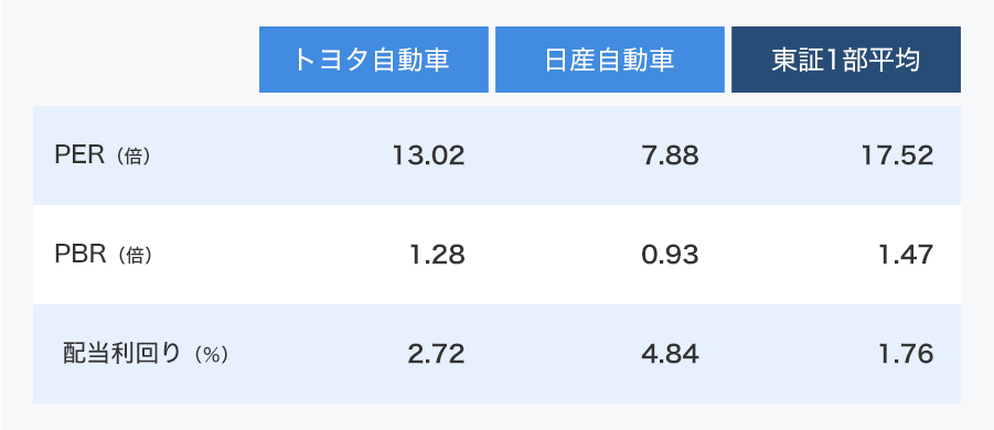配当利回りはどうでしょうか。トヨタ自動車、日産自動車とも東証1部平均よりも高い利回りになっています。両社とも比較的、配当利回りが高いといえるでしょう。さらに両社を比べると、日産自動車のほうが2%ほど高いです。両社が今後も安定して配当を支払い続ける見込みがあるならば、配当金目的で投資した場合は日産自動車が有利です。