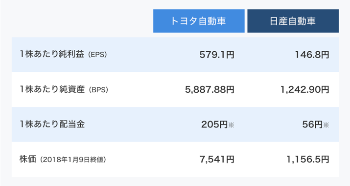 それでは、PER、PBR、配当利回りで比べてどちらが投資先として割安かを検証します。取り上げるのはトヨタ自動車(証券コード:7203)と日産自動車(7201)の大手自動車メーカー2社です。まず、両者の財務データを掲載します。