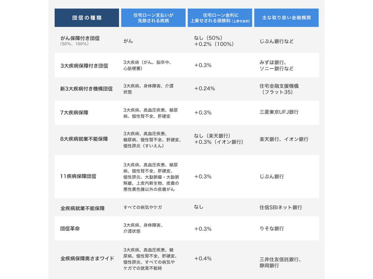 団信とは、住宅ローンの契約者が死亡・高度障害状態になると、それ以降の住宅ローンの返済が免除される保険のことです。各銀行は、団信に「特約」を付けて保障の範囲を広げたり、特定の疾患への保障を手厚くしたりするなど、さまざまな保障を提供しています。特約の保険料は無料だったり、住宅ローン金利に上乗せする形で支払ったりなど、ローンを組む銀行によって違います。