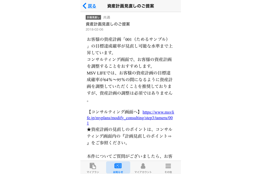 画面は「MSV LIFE」のアフターフォロー例。市場環境が大きく変わるなどして目標リターンの到達可能性が高まったり、低くなったりした場合、すぐに資産計画の見直しが提案される