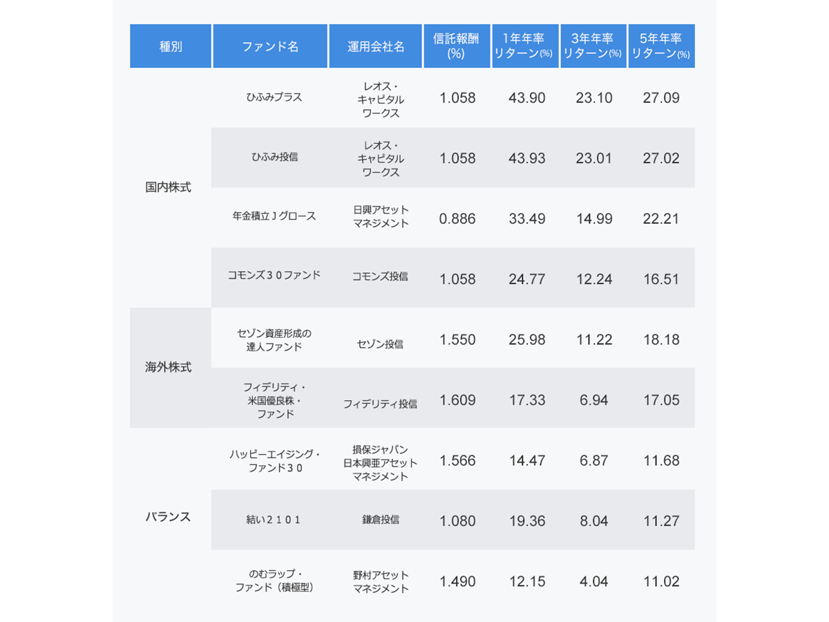 (2018年1月末時点、種別ごとに直近5年年率リターンの高い順に抜粋、リターンは信託報酬控除後、投資対象に債券を含むものをバランスと分類する、信託報酬は小数点以下4桁を四捨五入し3桁表示)