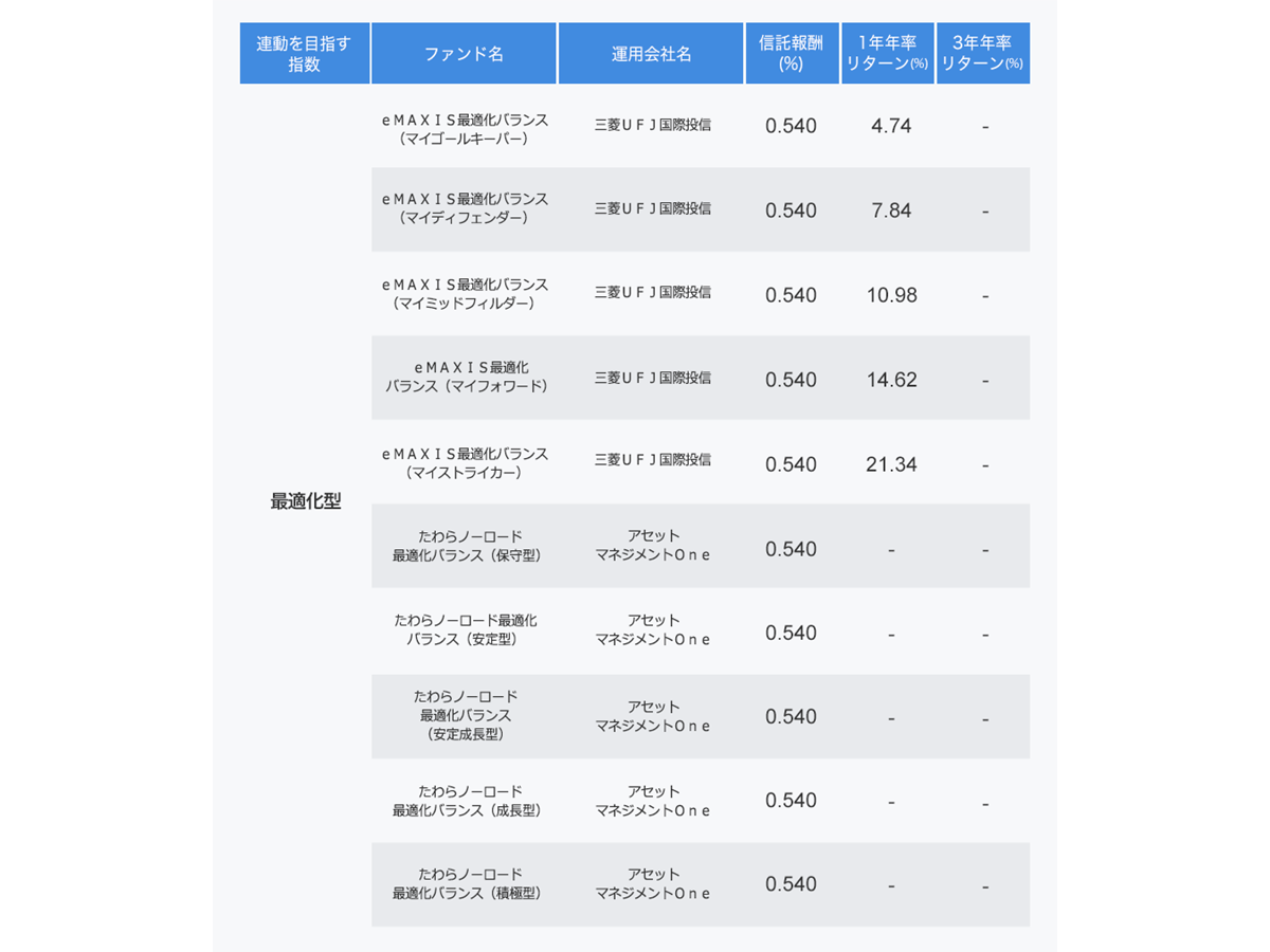 ここでは、特徴的なファンドとして、「最適化型」と「資産均等型」と「ターゲットイヤー型」を解説します。(2018年1月末時点、バランスファンドの分類は著者、信託報酬は小数点以下4桁を四捨五入し3桁表示)