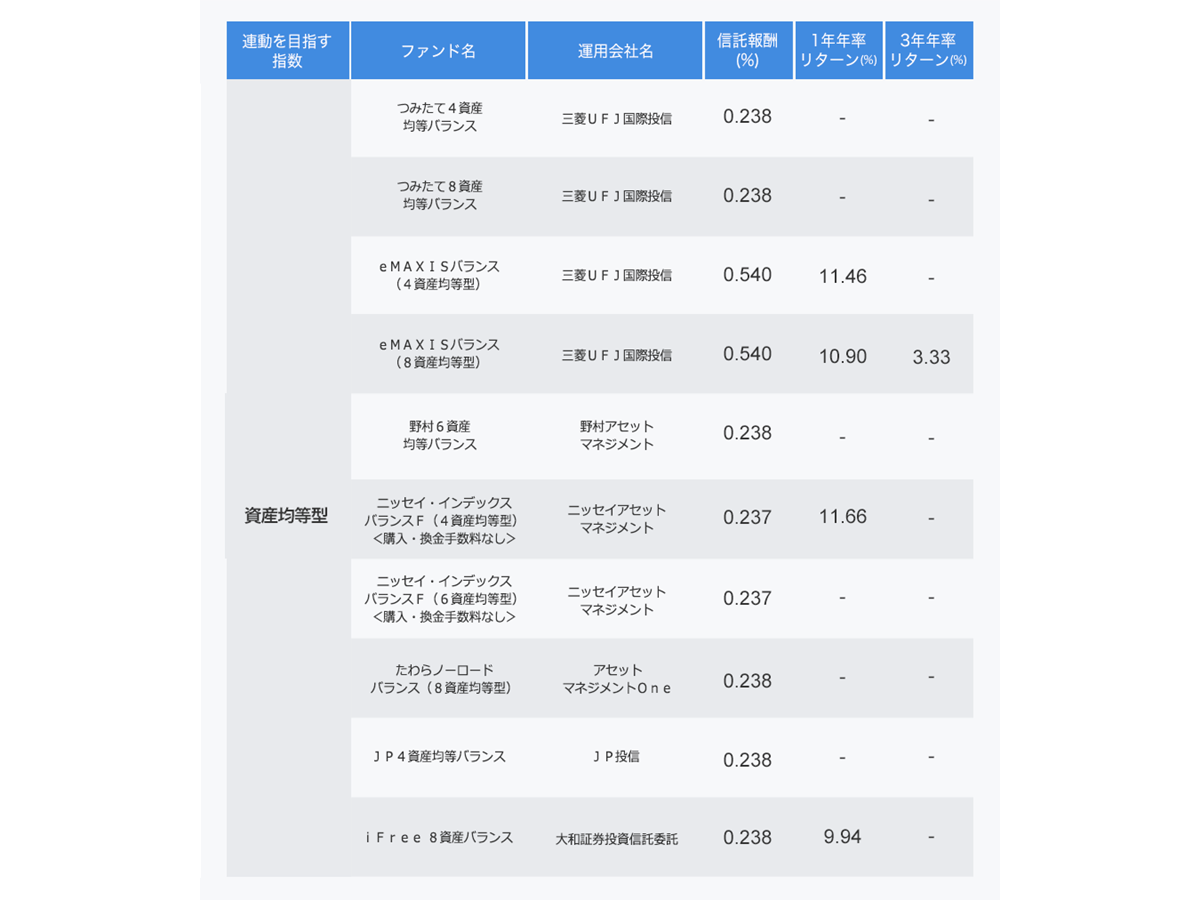 対象資産や指数ごとに、投資比率が均等になるようバランス良く組み入れるのが資産均等型ファンドです。それぞれの資産のインデックスファンドを同じ金額分購入し、定期的なリバランスもファンド内で実施してくれます。商品の仕組みがわかりやすく、ほかのバランスファンドと比べてコストが低いという特徴もあります。