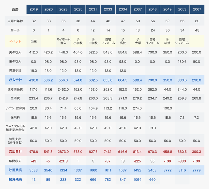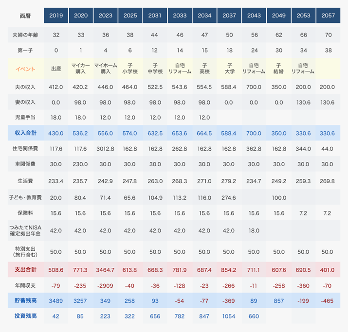 「いまの生活スタイルを維持しつつ、32歳で第一子誕生、36歳で5000万円のマンション購入というライフプランを盛り込んでいます。下段の貯蓄残高を見てください。住宅ローンは完済したものの、貯蓄残高はマイナスという、お金がなくて生活できない『破綻状態』に、66歳時点ですでに陥っています。定年退職してわずか5年です」