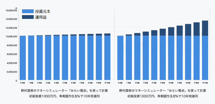利回りが年0.5%と年3%では、運用益の増え方が全然違う