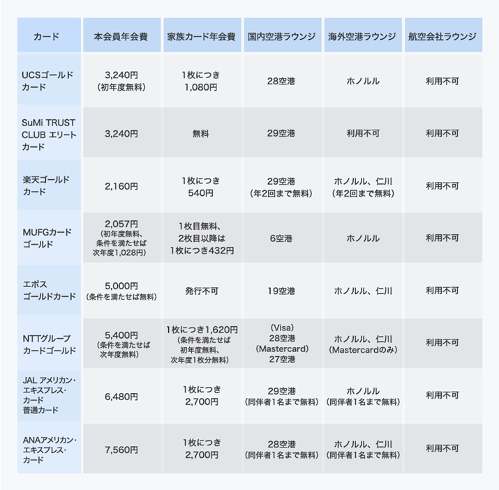 「UCSゴールドカード」は年会費3,240円で初年度は無料。国内28空港およびハワイ・ホノルルのダニエル・K・イノウエ国際空港のラウンジが利用できる。入会審査の目安は30歳以上、年収500万円以上、勤続5年以上。家族カードの年会費は1枚につき1,080円だが、本会員と同時に申し込んだ場合は初年度無料になる。