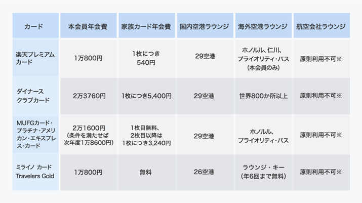 ラウンジ・キーを利用できるクレジットカードとして最安なのは「ミライノ カード Travelers Gold」。高校生を除く18歳以上の住信SBIネット銀行口座保有者のみ申し込みでき、年会費は1万800円。年6回まで無料でラウンジ・キー対象のラウンジを利用できる。7回目以降および同伴者は1回につき27米ドル。家族カードは年会費無料で、3枚まで発行できる。