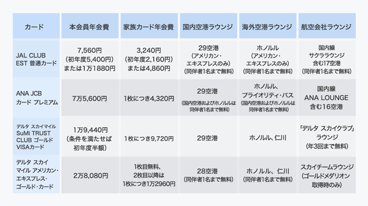 一般の空港ラウンジと比べてサービス内容が充実していたり、利用しやすい場所にあったりと、利便性が高い航空会社ラウンジが使えるクレジットカードで、おすすめは以下の4枚だ。