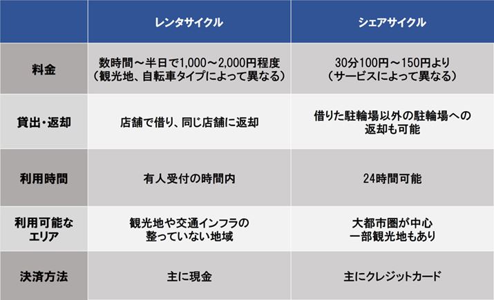 同じく自転車を借りるサービスとしては、これまでにも「レンタサイクル」がありましたが、利用者が事前に会員登録してスマートフォンなどを使って利用する点や、クレジットカードなどで支払うシステム、借りた駐輪場(サイクルポートやサイクルステーションなどと呼ばれます)と違う場所で返却できるフレキシブルさなどが異なっています。