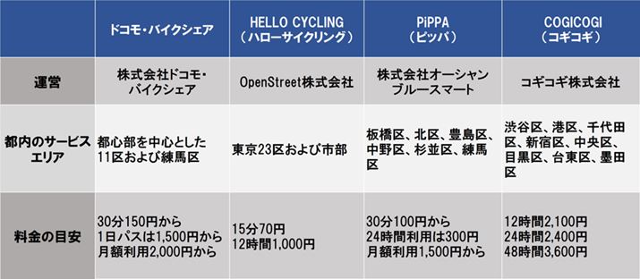 シェアサイクルは、東京をはじめ札幌、仙台、横浜、大阪、京都、広島、福岡などの都市部を中心に、現在進行形で全国に拡大しています。基本的なシステムや使い方は似ているものが多いので、まずはこの4つのサービスをシェアサイクルの入り口にしてもらえればと思います。