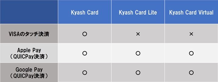 2020年5月7日時点のKyash各カードの非接触決済への対応状況
