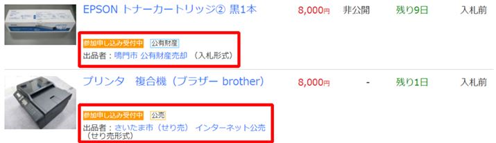 上の赤枠が、自治体が販売する「公有財産売却」。下の赤枠が、差し押さえ品を販売する「インターネット公売」。官公庁オークションの検索結果には、2つの販売方法が同時に表示されます(画像提供:Yahoo! JAPAN)