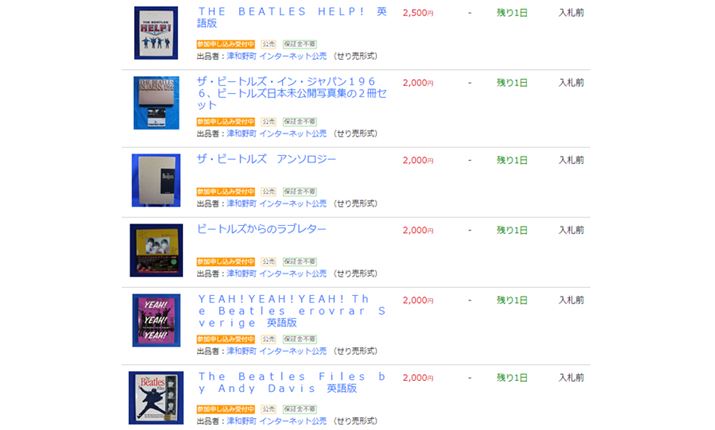 2019年7月の記事執筆時点で、島根県津和野町からインターネット公売で売り出されていたビートルズグッズの数々。ついつい出品の背景を想像してしまいます ※記事掲載時点で終了している可能性があります(画像提供:Yahoo! JAPAN)