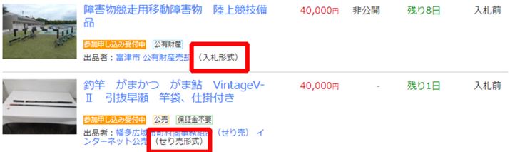 上の赤枠が「入札形式」。下の赤枠が「せり売形式」であることを表します。インターネット公売はせり売形式が多く(一部入札形式)、公有財産売却は入札形式のみ。入札形式では現在価格がわからない難しさがあります(画像提供:Yahoo! JAPAN)