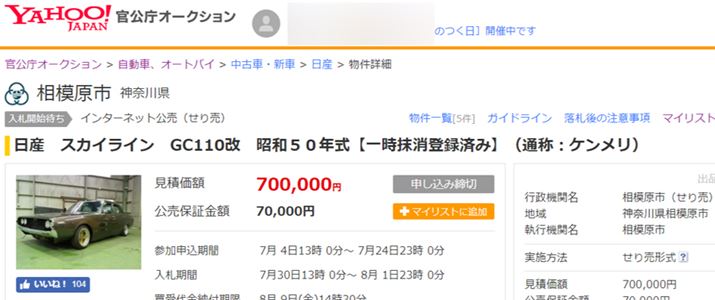 たとえば、一般の市場では500万円以上で落札されることもある「日産 スカイライン GC110改 昭和50年式」。通称「ケンメリ」の愛称で、旧車マニア垂涎(すいぜん)のこの車が、インターネット公売では「70万円からスタート」という激安で出品されているのは、そんな背景があったのですね。