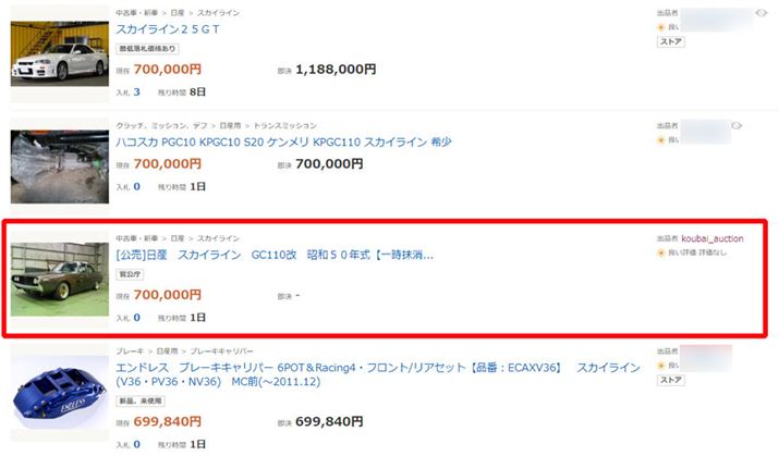ヤフオク!で「日産 スカイライン」で検索すると、ほかの出品物と一緒に官公庁オークションに出品されていた”ケンメリ”も出てきます。目印はタイトル前についている”公売”の文字と、出品者が”koubai_auction”になっていること ※記事掲載時点で公売を締めきっているため現在は検索結果に表示されません(画像提供:Yahoo! JAPAN)