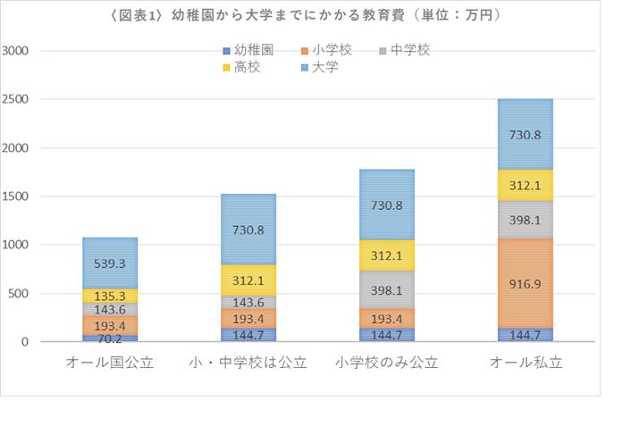 幼稚園から高校までについては文部科学省「子どもの学習費調査(平成28年度)」を、大学については日本政策金融公庫「平成30年度 教育費負担の実態調査結果」を利用して、シミュレーションしたのが図表1です(大学は自宅通学、私立大学の文系に通ったとして試算)。
