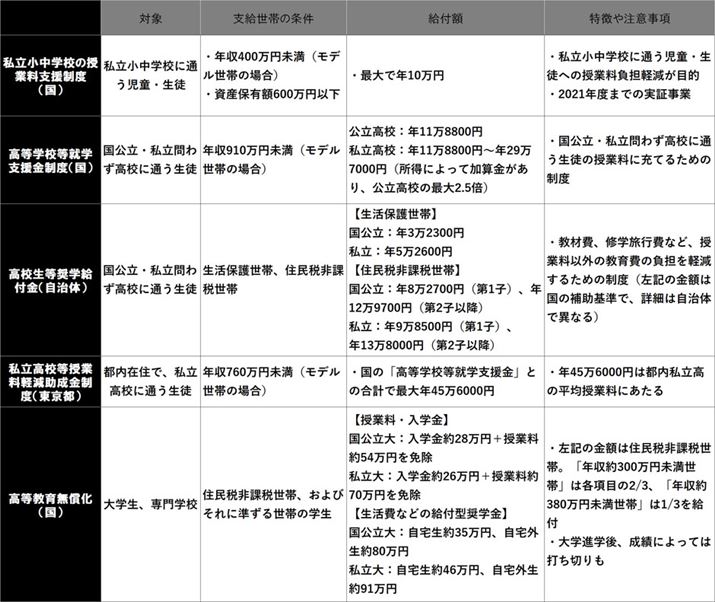 高校生向けの支援は、国公立や私立を問わず比較的幅広い世帯を対象とする(2)の「高等学校等就学支援金制度」(この制度により公立高校の授業料は実質無償)に、低所得者向けの(3)の「高校生等奨学給付金制度」(授業料以外の教育費を支援)が加わる形になります。これらに加え、自治体独自で私立高校生向けに(4)の「私立高校等授業料軽減助成」などを給付している場合もあります。