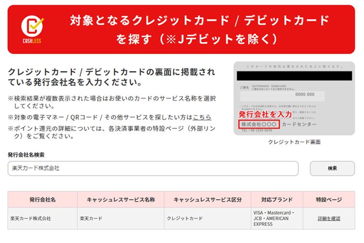 ポイント還元事業公式サイトの「消費者の皆様」→「キャッシュレス決済サービスを探す」→「クレジットカード/デビットカードを探す(Jデビットは除く)」と進み本画面へ(https://cashless.go.jp/consumer/bin-settlement-company-typeA.html)。カードの発行会社で検索をかけると、ポイント還元事業に参加しているかどうかがわかります。