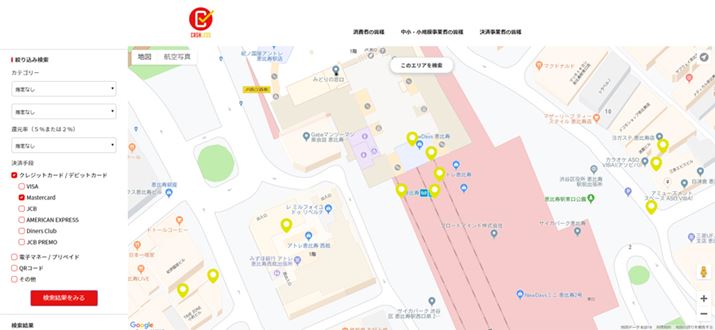 JR恵比寿駅近辺でポイント還元事業の対象の店舗を検索