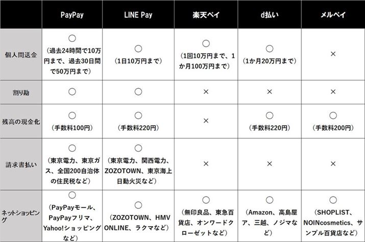 (主要なスマホ決済であるPayPay、LINE Pay、楽天ペイ、d払い、メルペイについて、どの機能に対応しているかについても紹介します)