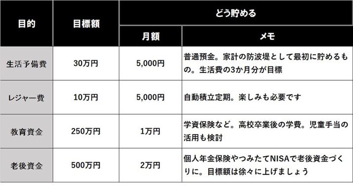 ほかにも、レジャー費や子どもの教育資金、老後資金、表にはありませんが、住宅を買う予定なら住宅資金も加えましょう。後はどうやって貯めるかの方針について記入するだけです。