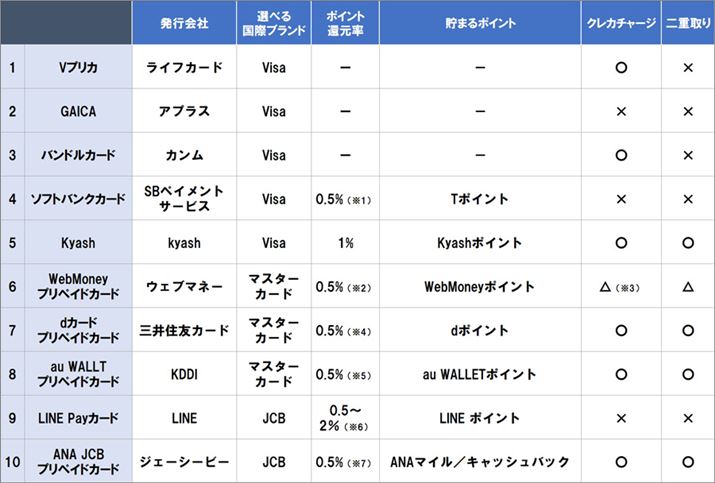 下記は、今回紹介した10枚のブランドプリペイドを比較した表です。使いたい国際ブランドや、ポイント還元率など、ご自身が重視する指標で選んでいただければと思います。