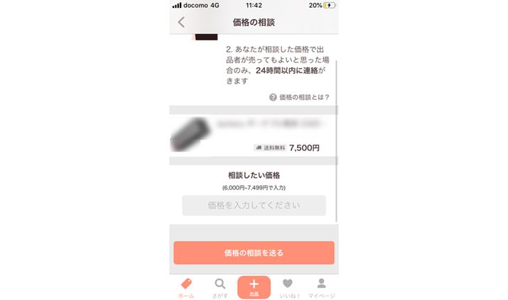 PayPayフリマの「価格の相談」機能は、購入希望者が値下げ希望額を入力して出品者に打診する仕組み。その際、メルカリやラクマにあるようなコメントは必要なく、純粋に値段だけの交渉となります。この機能は、ヤフオク!から出品され、PayPayフリマに掲載された商品では使えません