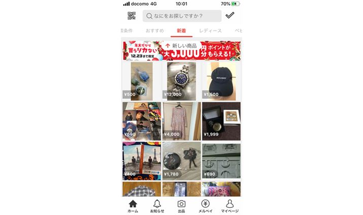 メルカリのトップ画面。2019年2月に実装された決済サービスのメルペイは、画面右下のメルペイをタップすることで利用可能