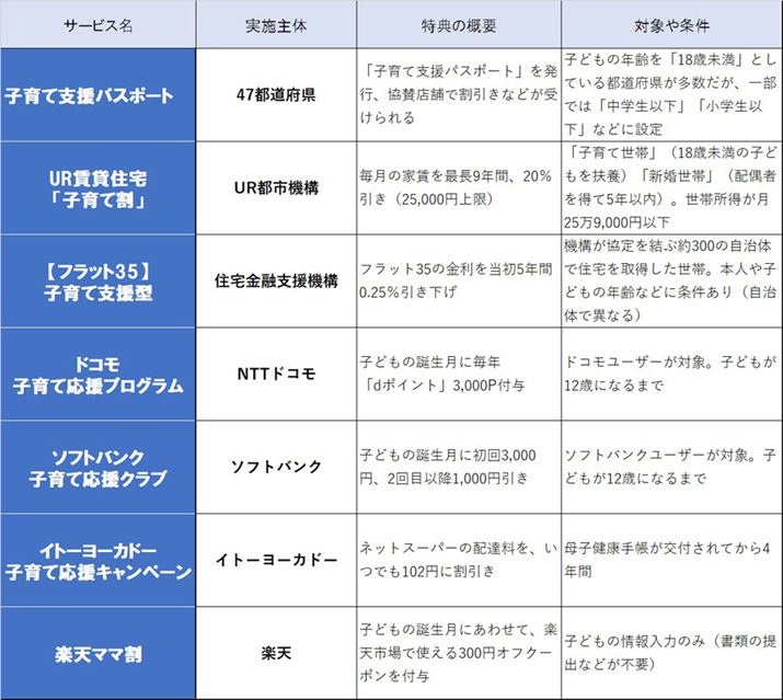 以上、子育て世帯に向けた優待サービスを紹介してきました。各サービスの概要を以下に表にまとめました。