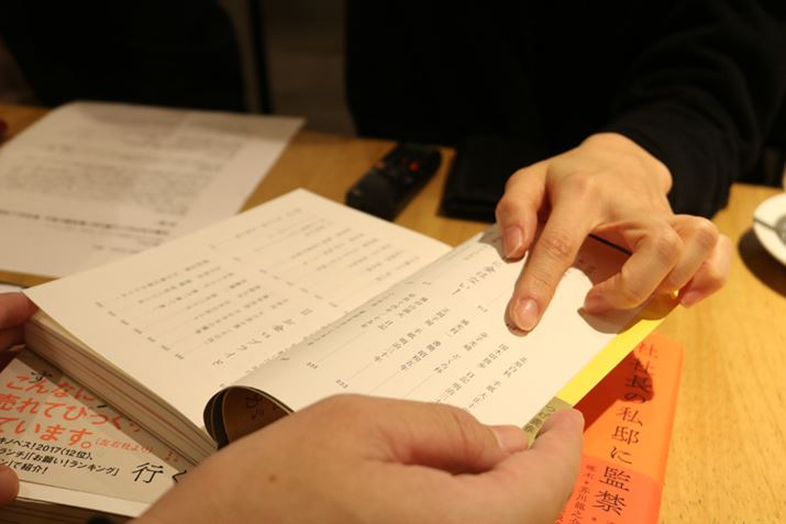 梅原志歩(うめはらしほ)さん(お顔出しNGとのことで目次を説明してくれている奥の女性がご本人です)。株式会社左右社 第一編集部。19年4月に左右社に入社し「お金本」の編集担当に。編集作業では「国木田独歩と金子光晴のエピソードを並べる」(本文で後述)など構成を考えるうえで苦労があったそう
