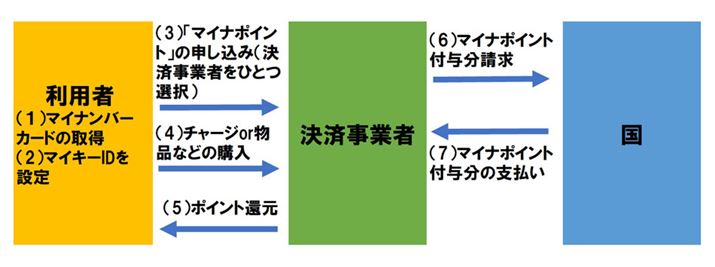 「マイナポイント事業」は前述のとおりマイナンバーカードの普及とともに、消費活性化などを目的に実施される事業です。大まかな流れは、