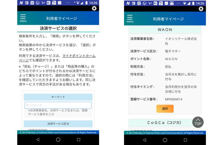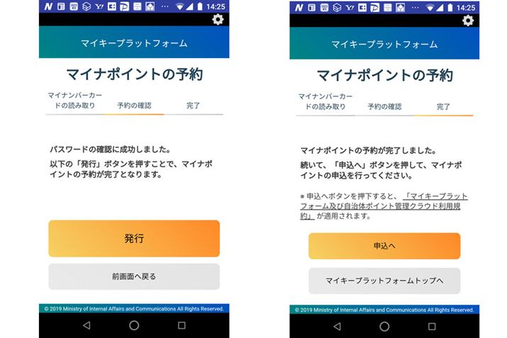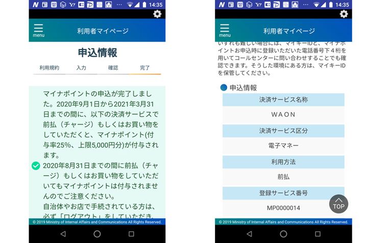 (4)パスワードが確認されれば、マイキーIDの発行が完了。続けて、ひも付けるキャッシュレス決済サービスを選択する「マイナポイントの申し込み」を行うことも可能です(写真右)
