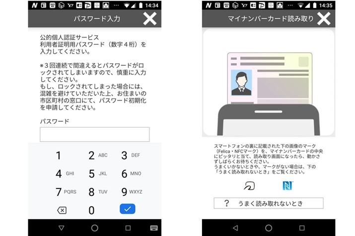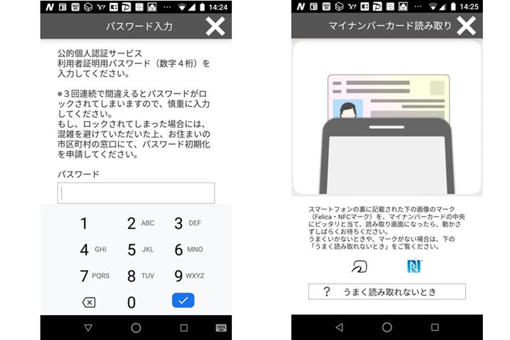(3)利用者証明用パスワード(数字4ケタ)を入力し、マイナンバーカードを読み取る。利用者証明用パスワードは、マイナンバーカードの受け取り、あるいは申し込みの際に設定したものです。3回間違えると、ロックされてしまうので慎重に入力しましょう。