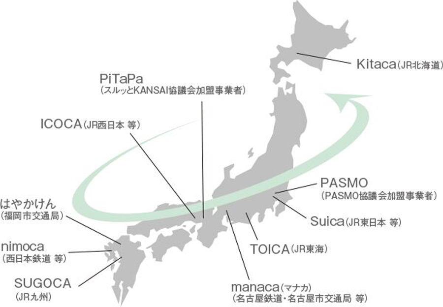 FeliCaの特徴は、かざすだけで高速でデータを送受信できることです。世界的に広く普及しているNFCの通信規格である「Type A/B」と比較して、その通信速度は倍以上。この通信速度の速さが、迅速な処理が求められる交通機関での普及にひと役買っています。1997年に香港の公共交通機関や電子マネーなどで使われる「オクトパスカード」で本格的に稼働。その後日本では2001年にJR東日本管内の乗車に使える「Suica」に採用され、全国の交通系ICカードにも広がっています(下記画像参照)。