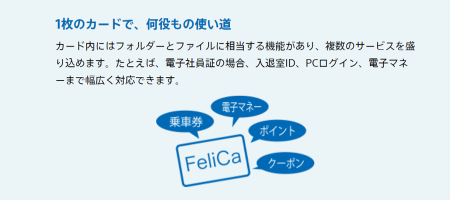 これ以外にも、学生証や社員証、ビルやオフィスの入館カード、マンションなどの電子キー、物流管理のICタグ、電子申請、家電製品など、FeliCaの活用シーンは多岐にわたります。