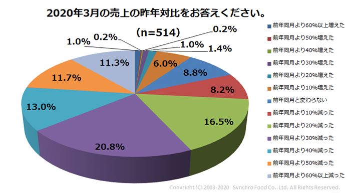 約8割の飲食店経営者が1年前と比べて3月の売上が「減った」と回答。「2020年3月の経営状況に関するアンケート調査」(飲食店リサーチ 株式会社シンクロ・フード調べ)