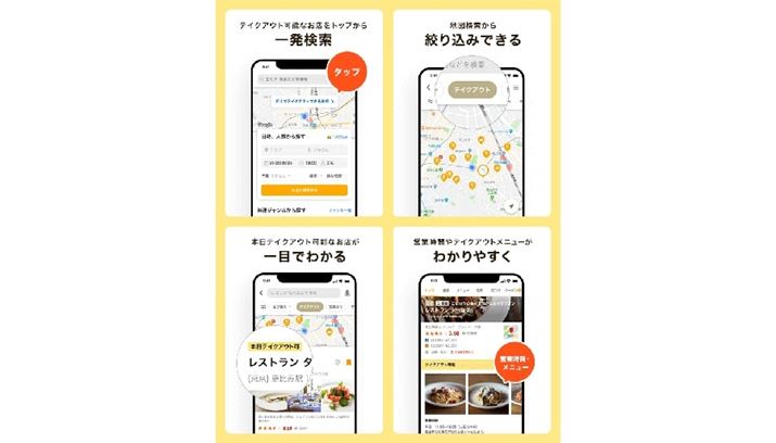 「食べログ」は、「テイクアウトできるお店」特集ページの開設、レストラン検索結果ページでの「本日テイクアウト可」ラベルの表示、アプリトップ画面から近隣のテイクアウト可能店舗をワンタップで検索可能にするなど(上画像)、テイクアウト可能店舗の検索機能を強化しています