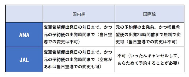 特典航空券の搭乗日時を変更する場合、ANAは国内線・国際線ともに発券の翌日から1年以内であれば何度でも無料でOK(必要マイルが増える場合は差額マイルが必要、搭乗者・区間・経由地・区間数などの変更は不可)。JALの国内線はANAと同様に1年以内なら無料で変更できますが、国際線は変更ができず、いったん手数料を払ってキャンセルして、改めて予約を取り直す必要があります(提携航空会社の特典航空券は変更可)。