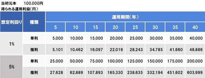 上記の表からもわかるとおり、運用益(想定利回り)が同じならば、投資期間が長ければ長いほど、複利の効果は大きくなり、単利との差が広がります。そのため、投資期間を長くできる若い人ほど、複利の効果を大きく得られます。また、まとまったお金がなくても少額から始められる積立投資のメリットも生かせるわけです。