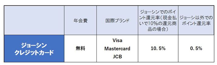 「ジョーシンクレジットカード」の年会費は無料。ジャックスとオリコの2社から発行されており、ジャックスは国際ブランドがVisa、Mastercard、JCB、オリコはMastercardまたはJCBから選択可能。どちらもジョーシンにおけるサービスは同一で、それぞれ発行会社が提供されるサービスは異なるものの、あまり大きな違いはない。