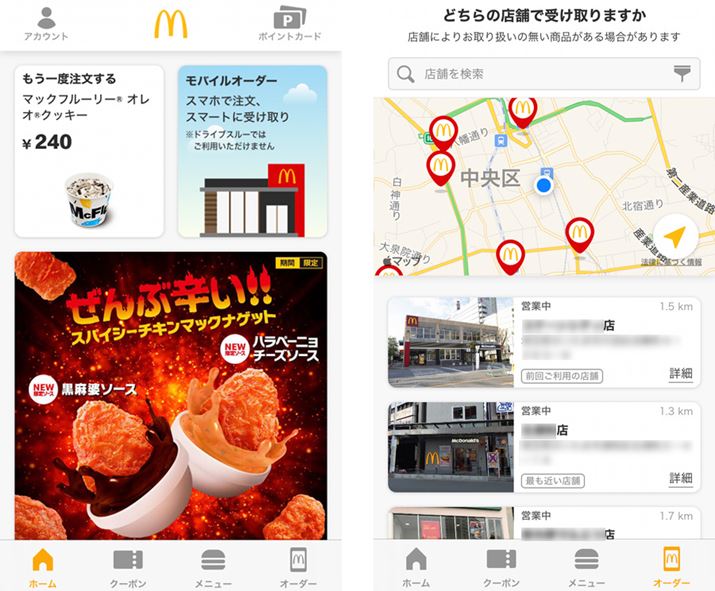 左:公式アプリのトップ画面。右上のモバイルオーダーからサービスに入ります。右:最初に利用したい店舗を選びます。スマホの位置情報をONにしておけば、店舗が近い順に表示される仕組みです